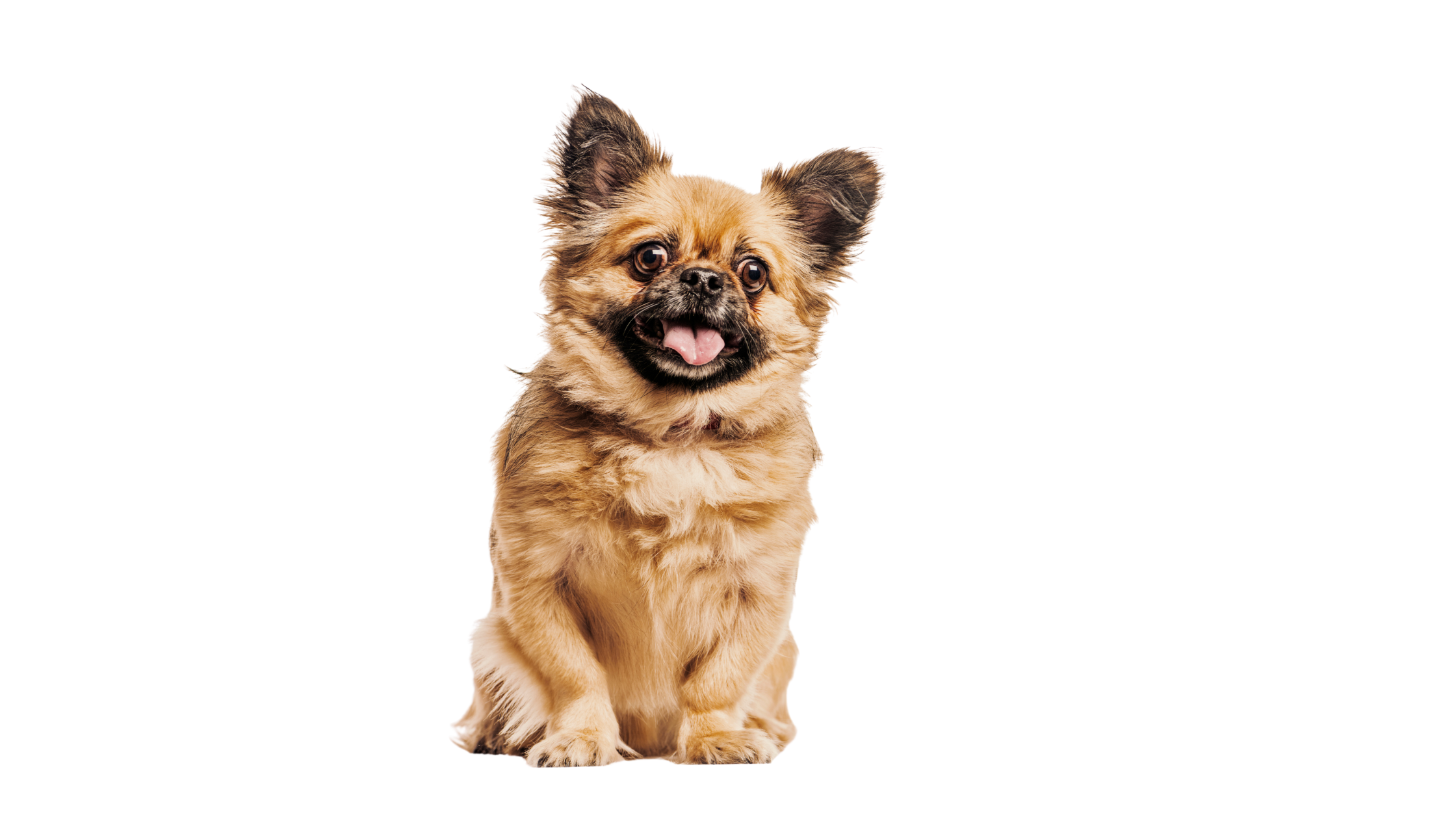 Small brown and black dog, possibly a Chihuahua mix, sitting with its tongue out and ears perked up, facing forward.